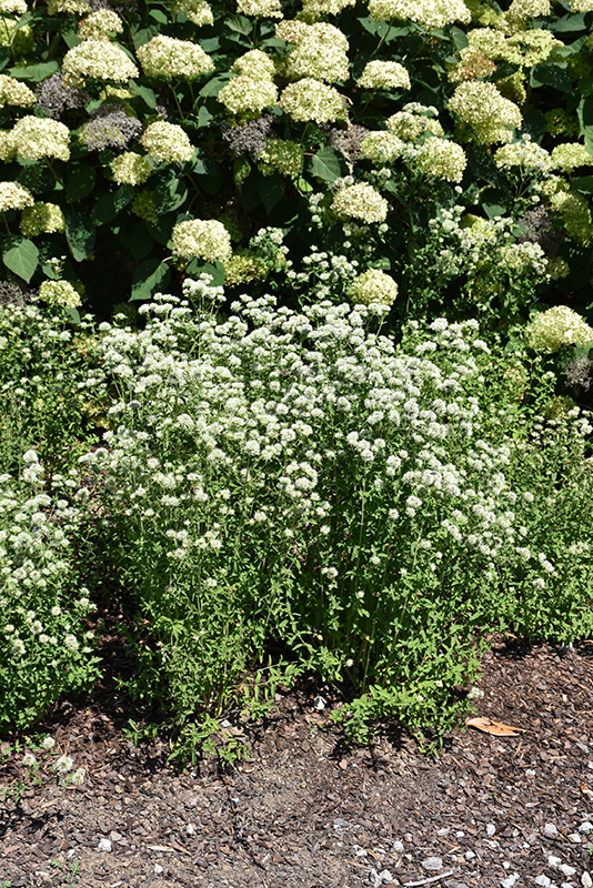 An aromatic, summer bloomer that produces silvery-white globular flowers on sturdy upright stems; blooms persist from summer through fall; green foliage takes on a red tinge in fall; an excellent border or container plant