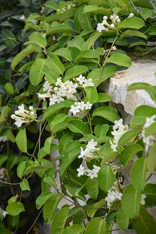 This vigorous climber bears dark green leathery leaves to contrast clusters of pure white tubular blooms that are highly fragrant; largely used for wedding arrangements; grows best in sunny, tropical conditions or indoors