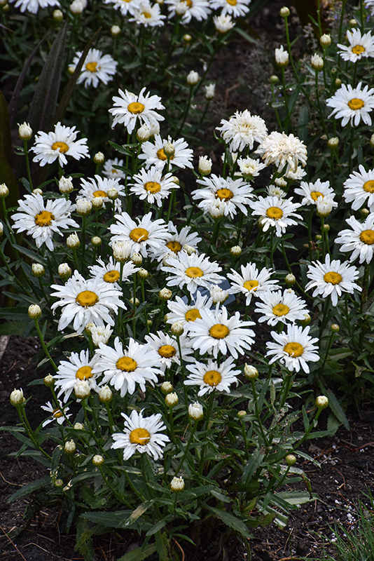 An outstanding, mounded variety producing full and fluffy white blooms with golden centers; a beautiful addition to the garden when massed; blooms throughout the summer
