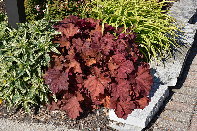 Rio Coral Bells features dainty spikes of white bell-shaped flowers rising above the foliage from late spring to mid fall. Its attractive crinkled lobed leaves emerge peach in spring, turning coppery-bronze in color with showy coral-pink variegation and tinges of buttery yellow the rest of the year.