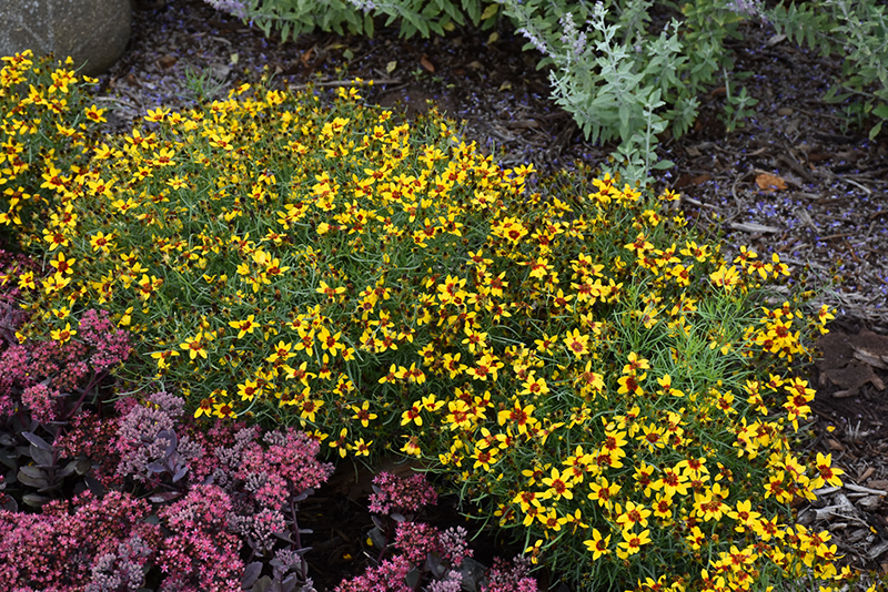 Sizzle And Spice® Curry Up Tickseed will grow to be about 15 inches tall at maturity, with a spread of 24 inches. Its foliage tends to remain dense right to the ground, not requiring facer plants in front. It grows at a medium rate, and under ideal conditions can be expected to live for approximately 8 years. As an herbaceous perennial, this plant will usually die back to the crown each winter, and will regrow from the base each spring. Be careful not to disturb the crown in late winter when it may not be readily seen!