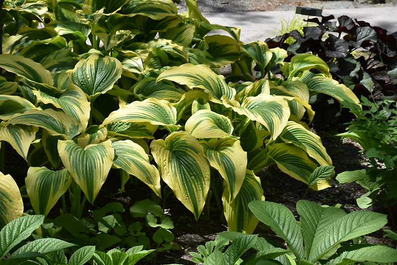 Gold-Variegated Mountain Hosta is a dense herbaceous perennial with tall flower stalks held atop a low mound of foliage. Its wonderfully bold, coarse texture can be very effective in a balanced garden composition.