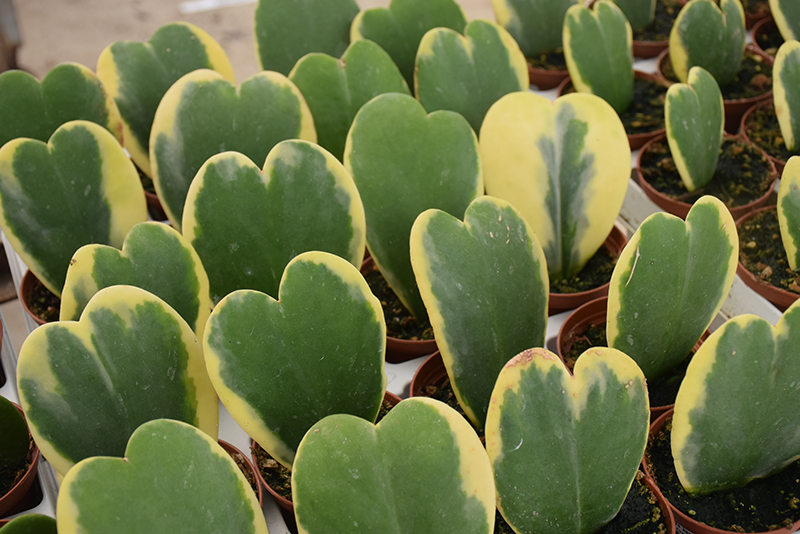 Variegated Sweetheart Plant features showy corymbs of lightly-scented shell pink star-shaped flowers with red eyes dangling from the stems in mid summer. Its attractive succulent heart-shaped leaves remain green in color with showy yellow variegation throughout the year.