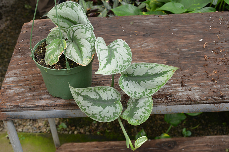 Exotica Silver Satin Pothos' attractive heart-shaped leaves remain dark green in color with showy silver variegation throughout the year on a plant with a spreading habit of growth.