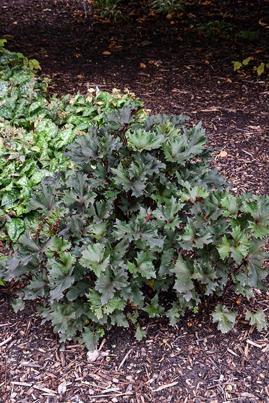 Attractive, rich, dark green heart shaped leaves are wavy and deeply serrated showing off the burgundy undersides; interesting dark purple stems carry bright yellow flowers above; great for a shady border planting