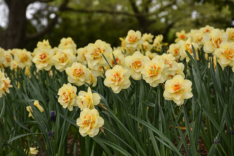 Tahiti Daffodil has masses of beautiful fragrant double yellow trumpet-shaped flowers with orange overtones and orange centers at the ends of the stems in mid spring, which are most effective when planted in groupings. The flowers are excellent for cutting. Its grassy leaves remain dark green in color throughout the season.